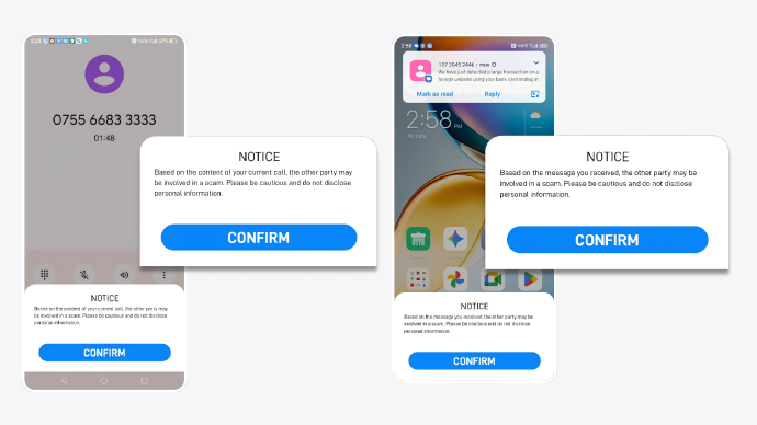 Al enhances online security by intelligently identifying scamcontent in voice calls and text messages, delivering real-timealerts to empower proactive evasion of cyber fraud.